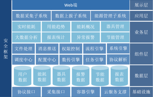能耗在线监测系统必须是一个能够长期可靠运行,并且不断持续完善的系统,从而能够在其生命周期内,不断扩展接入各行业用能单位的能耗监测数据,最终达到对用能企业数据的全面在线监测。为了达到上述要求,系统必须采用结构良好的框架结构,保证系统的各种业务与软件要素接口界面清晰,能够有效配合,支撑系统的应用功能,满足用户要求,同时使系统具备良好的可维护性与扩展性。按照本项目系统业务目标,系统总体逻辑架构划分为6个层次,2个支撑体系。